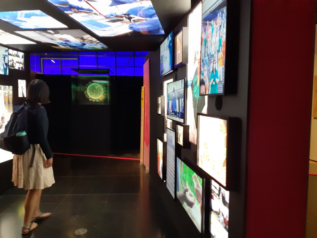 A pandemia de Covid também tem uma ala para estudo, da qual encontra-se televisões e uma sala interna com as informações do processo de busca por uma vacina em tempo hábil para aplicação pública.