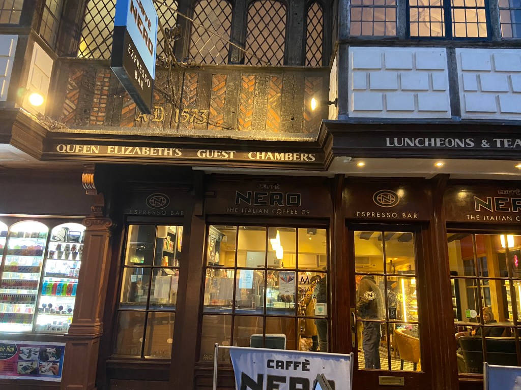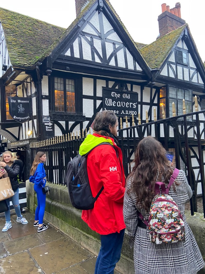 Geralmente essas casas antiguíssimas… converteram-se em pubs ingleses, e são geralmente de madeira pintada de branco e com as bordas pretas, indicativo de casa histórica e medieval, vale a dica… Elas geralmente possuem placas indicativas, vale as fotinhos.