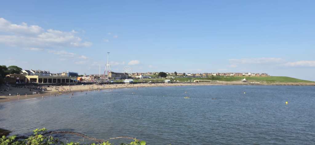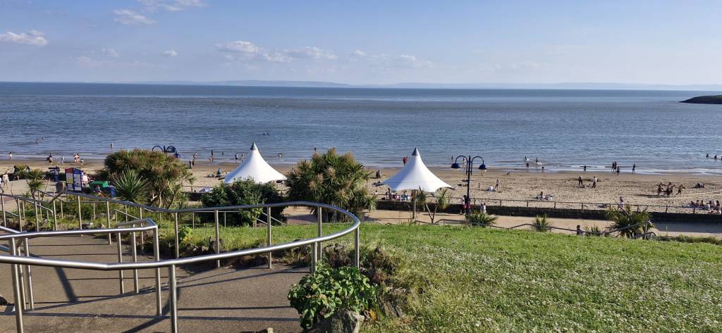 A praia possui planíces íngremes e consegue se escalar as escadas para o topo esquerdo que dá uma vista ampla de Barry Island.