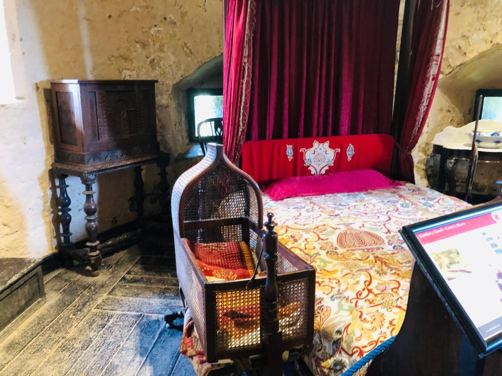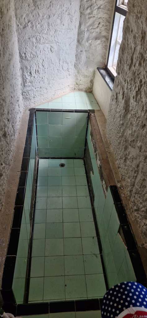 Ao lado esquerdo do castelo se possui toda a mobilia dividida em andares ingrímes. Gostei de uma banheira feita toda de azulejo azul no topo de um dos quartos do lado direito do castelo, nunca tinha visto uma banheira em uma construção tão antiga.. construída de tijolos e com uma janela com vista para os montes.